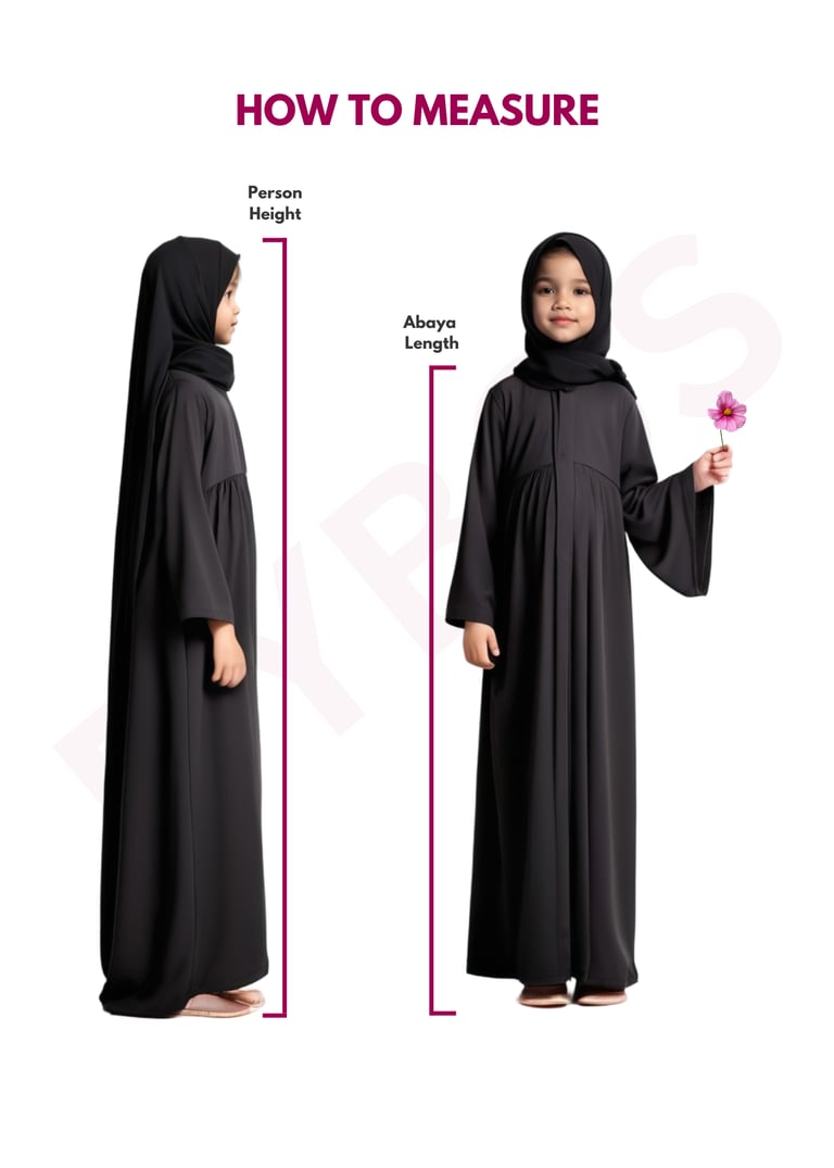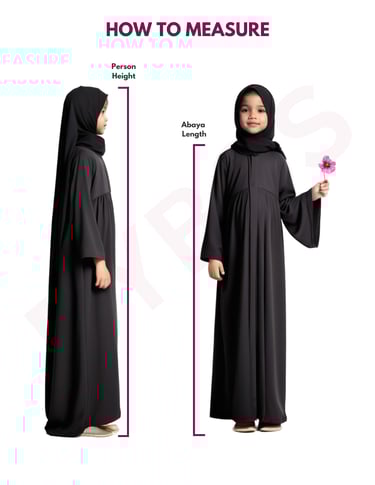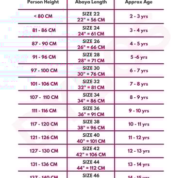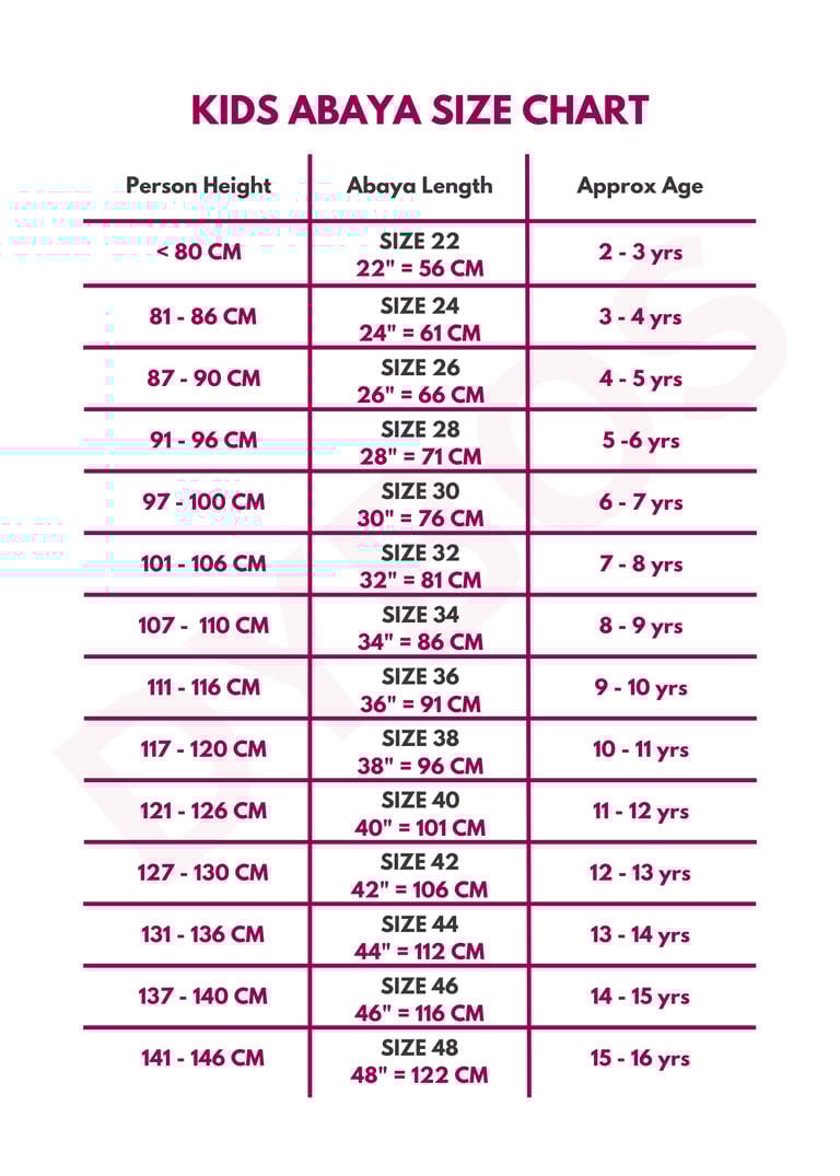 Refer to our size chart below to find your ideal size or the right size in kids abaya.