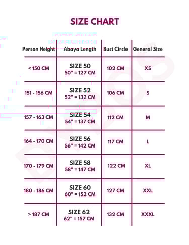 Abaya sizes are indicated in inches, with numbers like 50, 52, and 54 representing the length of the garment.