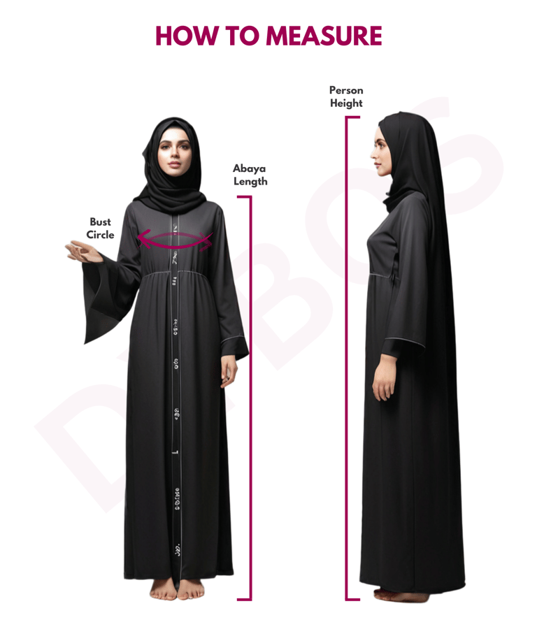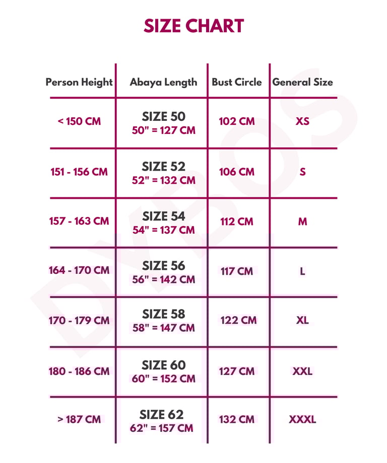 For example, a size 50 abaya measures 50 inches (127 cm) in length.